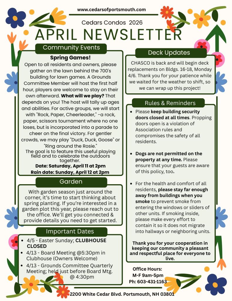 Our community garden is now open for 2026 registration, and we would love for you to be part of it. Whether you are a seasoned gardener or just getting started, this is a great way to enjoy the outdoors and be part of a shared community space. Residents (both owners and tenants) are welcome to apply for a garden spot. To participate, simply download the application form below and submit it to the Office.