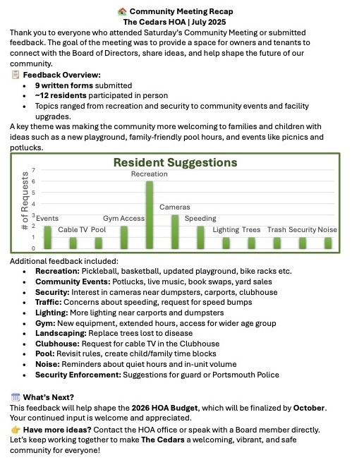 The meeting is intended to be both informational and an opportunity for the Board to hear from residents directly. Attached is a feedback form. If you have questions, suggestions or feedback, but can’t attend the meeting, please fill out the form and return it to the office.