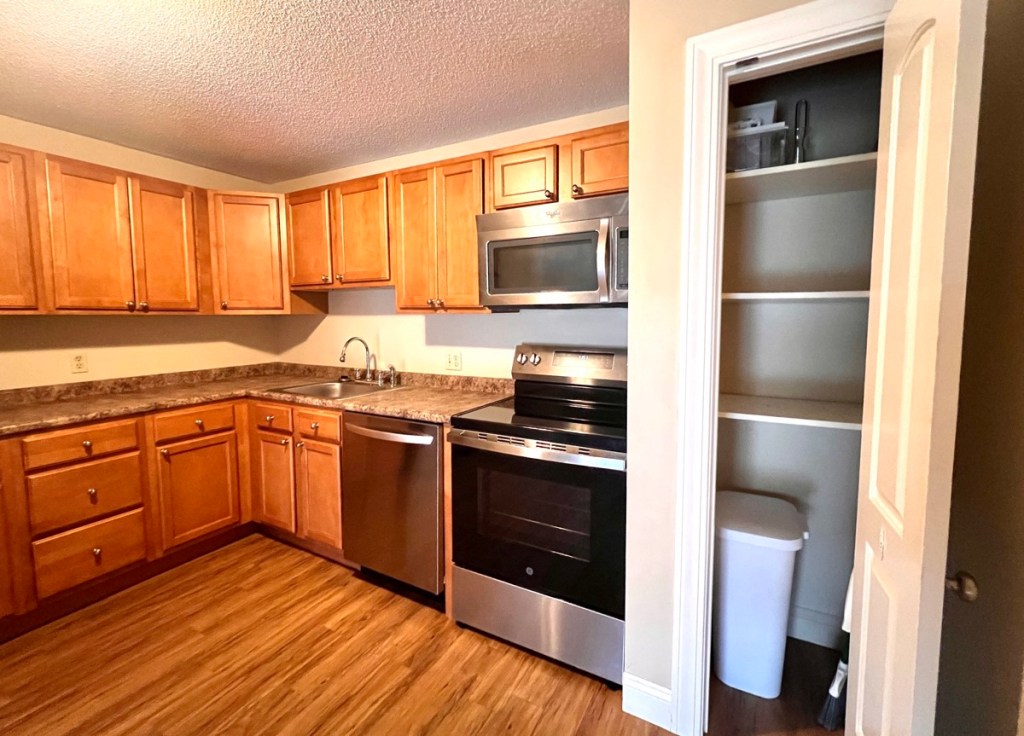 Kitchen has updated stainless steel appliances, a garbage disposal and a nice-sized pantry.