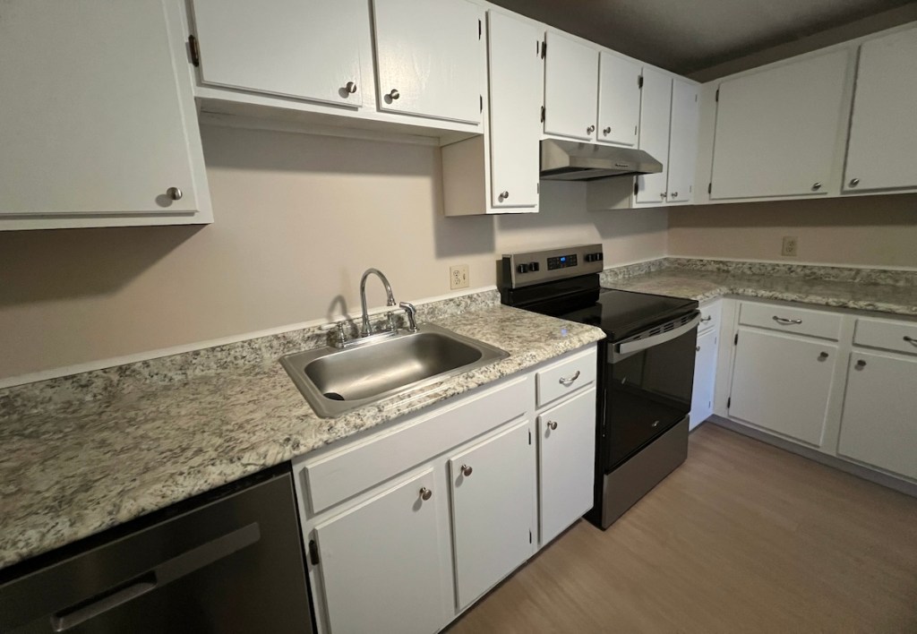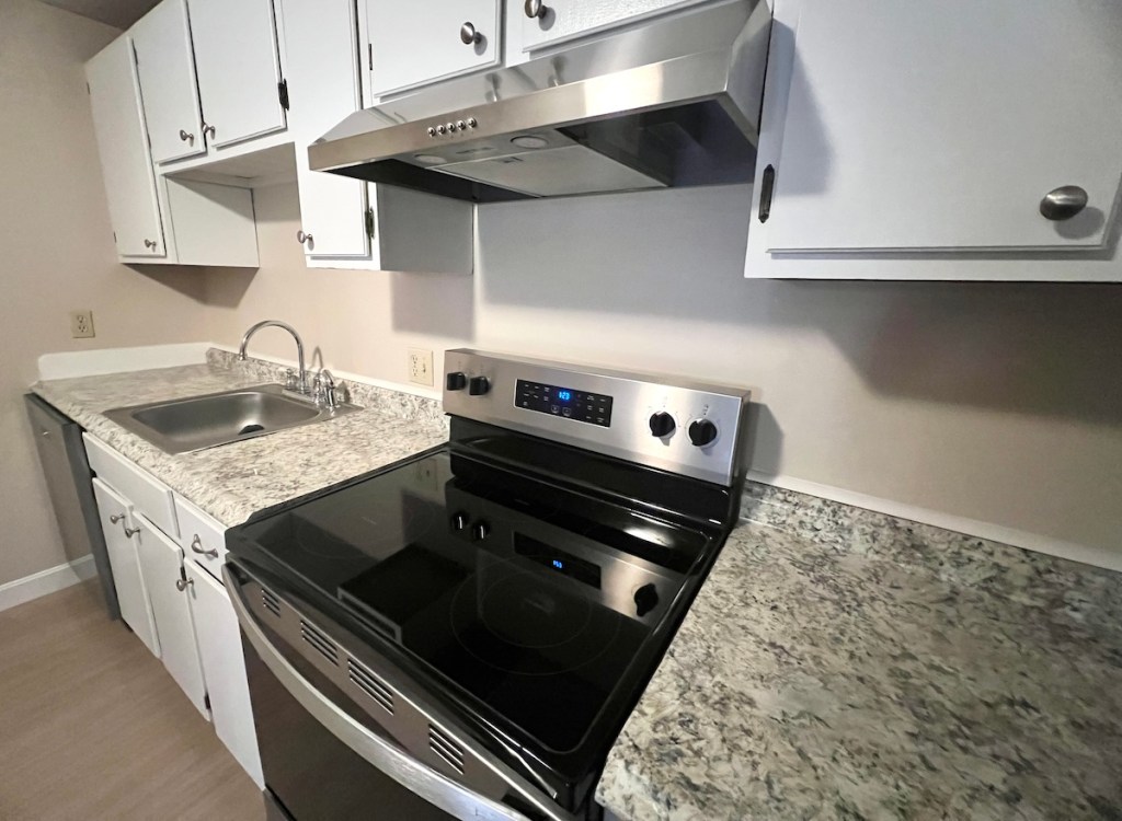 Kitchen has updated stainless steel appliances and a garbage disposal.