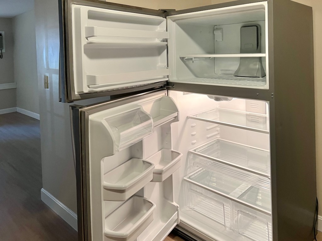 The floorplan shown below is approximate. Unit #801 differs from this floorplan in the setup of the laundry closet and the placement of the refrigerator in the kitchen area.